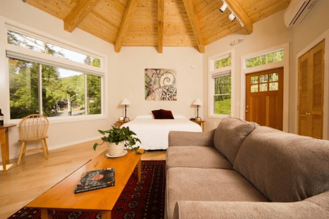 Atemberaubend komplett renoviertes Teilhaus aus dem Jahr 1970 im Wald! Das Ferienhaus liegt privat auf vier Hektar mit einem Bach und mäandernden Steinmauern und ist modern und dennoch rustikal, mit einem Dekor aus der Mitte des Jahrhunderts. Das Erdgeschoss verfügt über ein Wohnzimmer mit einem schönen raumhohen Steinkamin (gasbetrieben), eine Küche, ein Badezimmer und ein Büro mit einem Schreibtisch und einem Doppelbett. Der zweite Stock verfügt über ein Hauptschlafzimmer mit Queensize-Bett und einen separaten Loftbereich mit Schreibtisch. Tolle Unterkunft zum Entspannen in der Natur - ein perfekter Kurzurlaub für Paare!