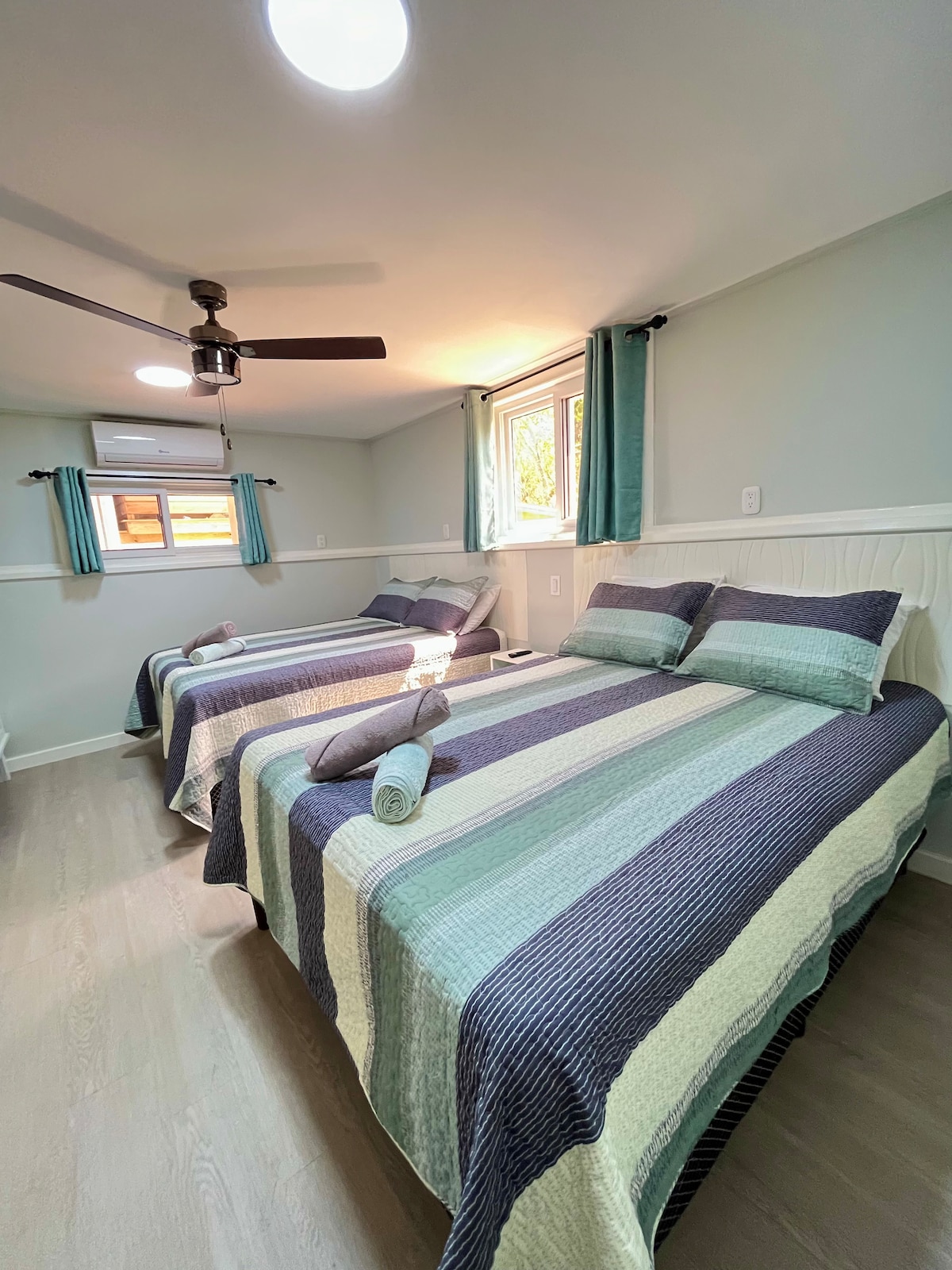 Alles ist zu Fuß erreichbar! Perfekt gelegenes Haus mit 2 Schlafzimmern/2 Bädern für 6 Personen mit einem Kingsize-Bett und zwei Queensize-Betten, alle mit Gel-Memory-Schaumstoffmatratzen für luxuriösen Komfort. Jedes Zimmer verfügt über einen eigenen privaten Eingang und ein eigenes Badezimmer sowie eine gemeinsame Veranda. Genieße eine voll ausgestattete Küche, Klimaanlage und kostenfreies WLAN. Der Hinterhof am Wasser verfügt über eine Lagune und eine Bootsanlegestelle. Nur 7 Gehminuten vom Bando Beach und nur wenige Schritte von den besten Tauchshops, Trudys Restaurant und Mango Tango entfernt. Top-Lage für Taucher und Urlauber!
