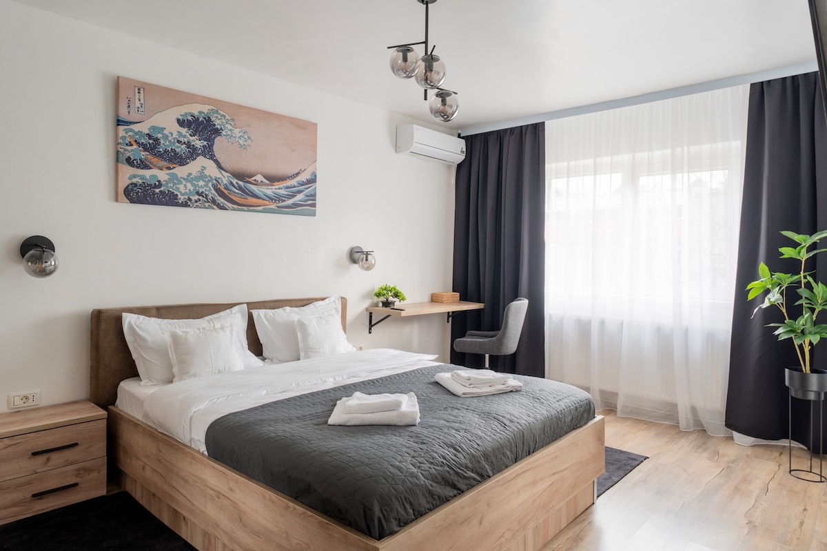 Silent Wave Apartment — ein helles, modernes Studio, perfekt für aktive Reisende und Remote-Mitarbeiter. Genieße ein gemütliches Doppelbett, warme Holzakzente, natürliches Licht und ein stilvolles Wellenkunstwerk, das die Stimmung bestimmt. Mit einem eleganten Arbeitsbereich, Klimaanlage und minimalistischem Dekor ist es der ideale Ort, um sich zu entspannen, aufzutanken und einen ruhigen, gut gestalteten Raum zu genießen.