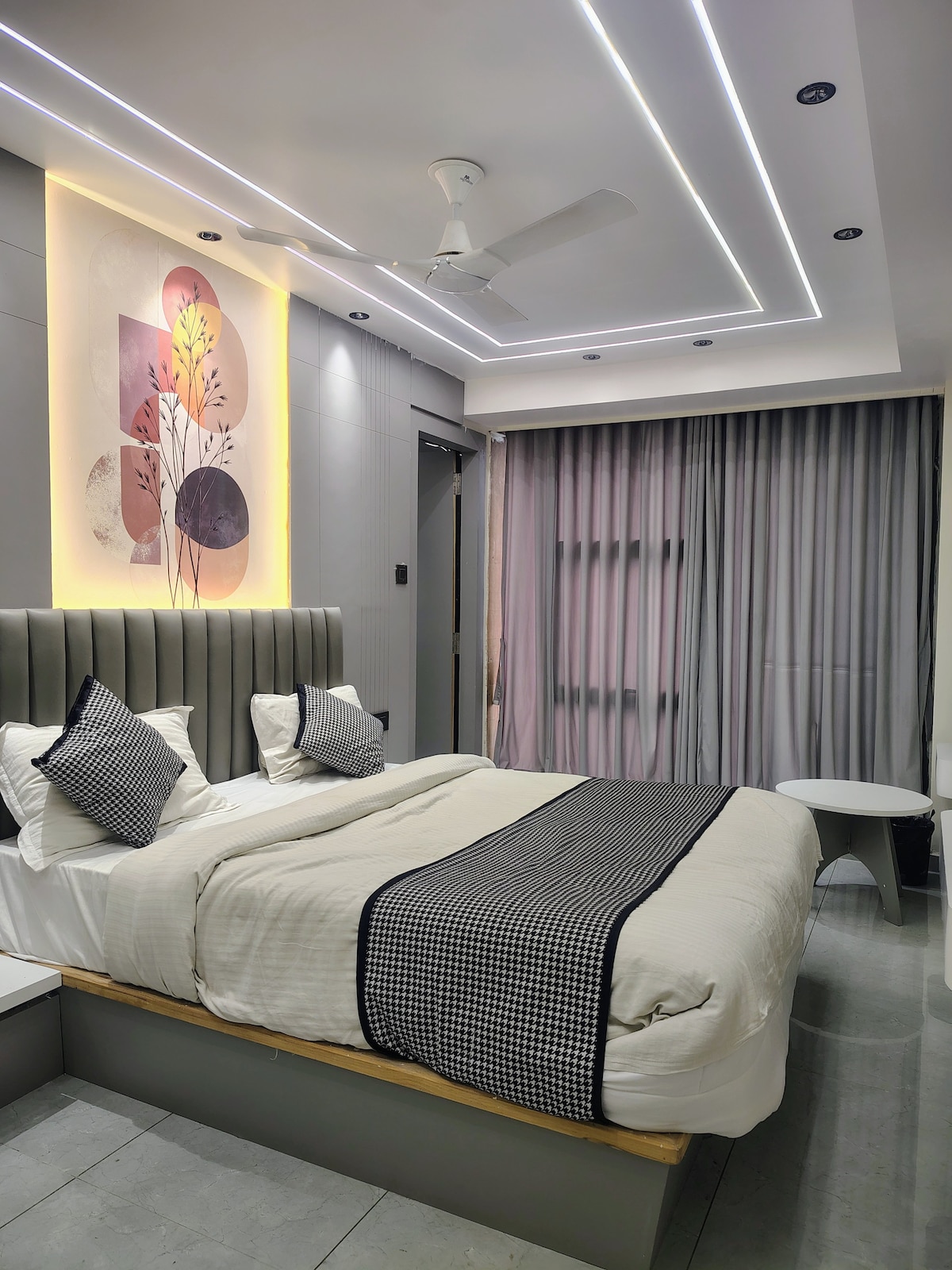 Willkommen in deinem eleganten Rückzugsort, nur wenige Minuten vom Flughafen Vadodara entfernt! Dieses geräumige Super-Deluxe-Zimmer verfügt über ein einzigartiges rundes Bett mit weicher Polsterung, moderne Möbel und schöne Designerwände, um einen unvergesslichen Aufenthalt zu gewährleisten. Rundes Designer-Doppelbett mit Premium-Matratze Schnelles WLAN & Smart-Fernseher Geteilte Klimaanlage und Verdunkelungsvorhänge für einen kühlen, ruhigen Schlaf Privates Badezimmer mit allem Notwendigen Kostenloser Tee/Kaffee und Trinkwasser Unterstützung vor Ort und tägliche Zimmerreinigung