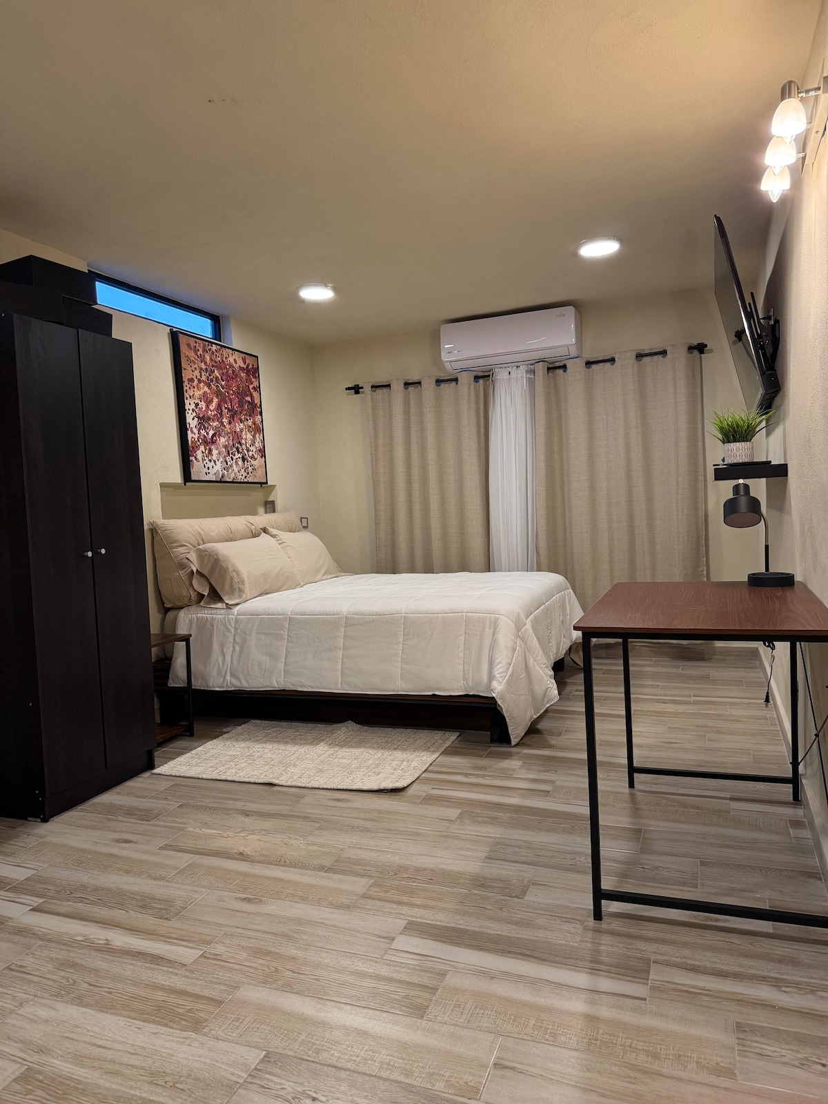 Komfortable und makellos saubere Wohnung, Doppelbett. 32" LED-TV mit Youtube, Minisplit Kalt/Warm, WLAN, Bad, Miniküche mit Induktionsherd, Minibar, Mikrowelle, Mixer, Spüle, Frühstücksraum, Küchenutensilien, Schrank, Schreibtisch, Fracc. Privat mit 24-Stunden-Sicherheitsdienst. Oxxo 24 Stunden nur wenige Schritte entfernt. Keine Kinder - Keine Haustiere, keine Ausnahme