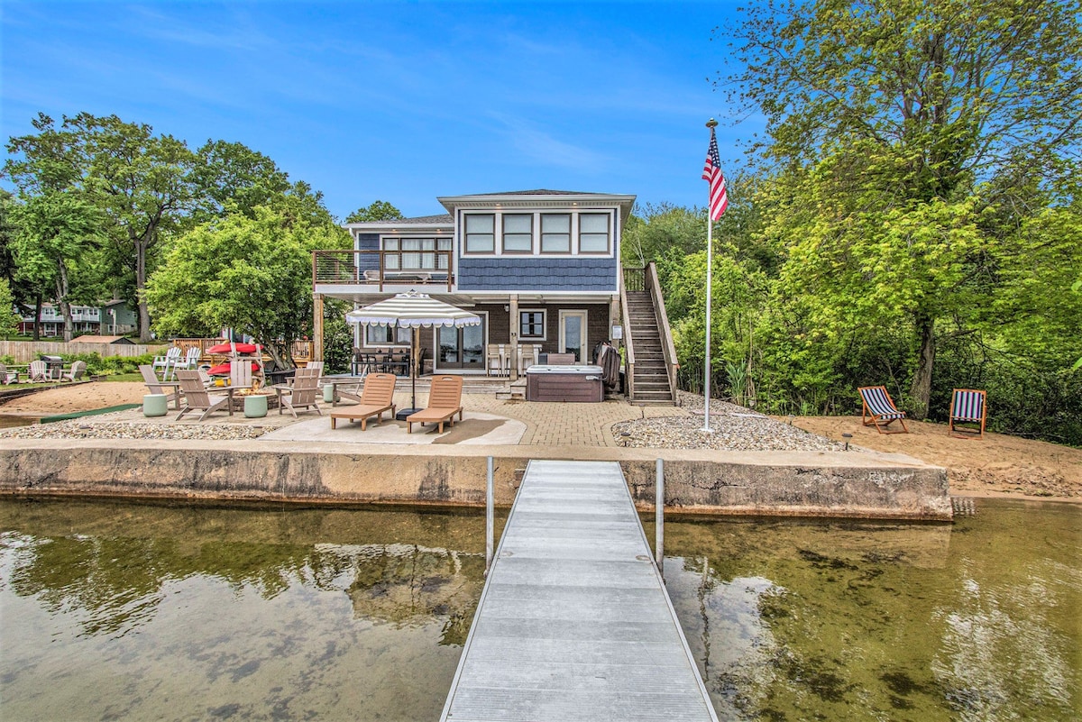 Entdecke deinen Kurzurlaub am See in Shore Haven am Silver Lake, nur wenige Minuten von South Haven entfernt. Dieses 2.000 Quadratfuß große Ranchhaus bietet über 75 Fuß All-Sport am Wasser. Mit einem weitläufigen großen Zimmer, zwei Queensize-Schlafzimmern und einem Kingsize-Doppelbett mit eigenem Bad ist es perfekt für Entspannung oder Spaß. Genieße Annehmlichkeiten wie einen Billardtisch, Gesellschaftsspiele, eine zweistöckige Terrasse und eine Feuerstelle. Panoramablick auf das Wasser & 15 Min. zu Weingütern & Schneepisten