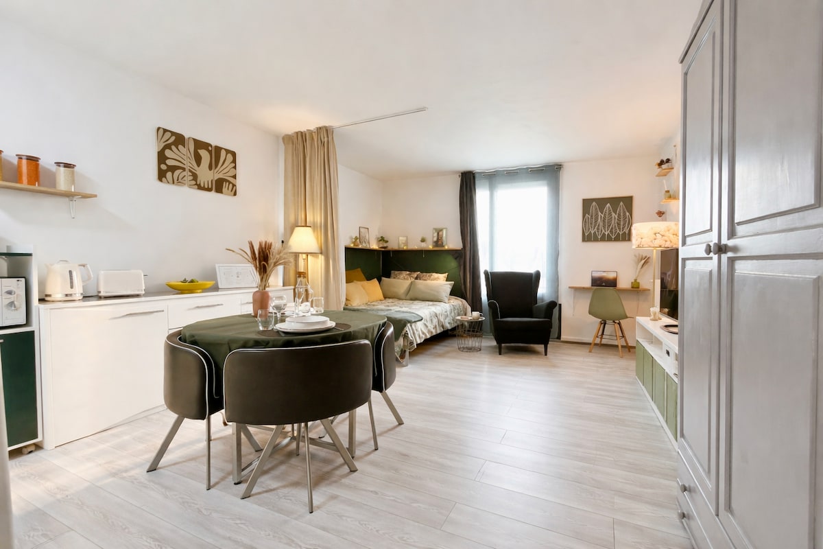 Ein schönes, komplettes und privates Haus: ein 23 m² großes Studio mit Wohnzimmer, Einbauküche, Schlafzimmer, Bad und WC, ein kleiner Garten von ca. 16 m², in dem Sie Ihre Fahrräder abstellen können, im Stadtzentrum von Margny les Compiègne, 6 Minuten zu Fuß vom Bahnhof Compiègne entfernt, öffentliche Parkplätze 2 Stunden kostenlos mit Parkscheibe. Wir bieten Ihnen alles Notwendige: kostenloses WLAN, Smart-TV, Einbauküche, Waschmaschine, Haushaltswäsche (Bettwäsche, Handtücher...).