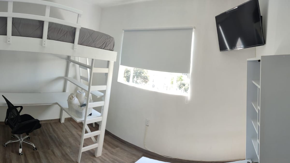 Cómoda habitación privada. Cuenta con cama matrimonial, área para trabajar, baño individual, televisión por cable e internet. De igual forma, hay espacio disponible para estacionar un carro pequeño dentro del inmueble. El horario de llegada puede ser flexible siempre y cuando se avise con antelación.