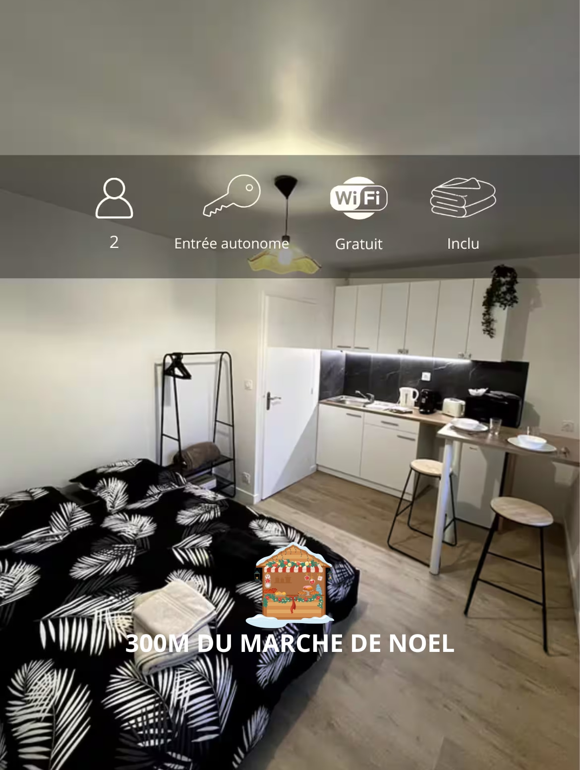 Studio ideal gelegen, in der Nähe des Stadtzentrums, des Schlosses und des Bahnhofs. (10 Min. zu Fuß). Auch zwei Minuten von einem Park mit Spielen für Kinder. In der Nähe von Supermärkten, Bäckereien und allen Geschäften. Die Unterkunft liegt in einer Sackgasse, gegenüber einem Wald, ruhig mit eigenem Parkplatz im Hof. (7 m lang) Bettwäsche und Handtücher sind im Mietpreis inbegriffen. Netflix inklusive. Ein 4-Sitzer-Whirlpool im Freien ist optional für 20 € erhältlich.