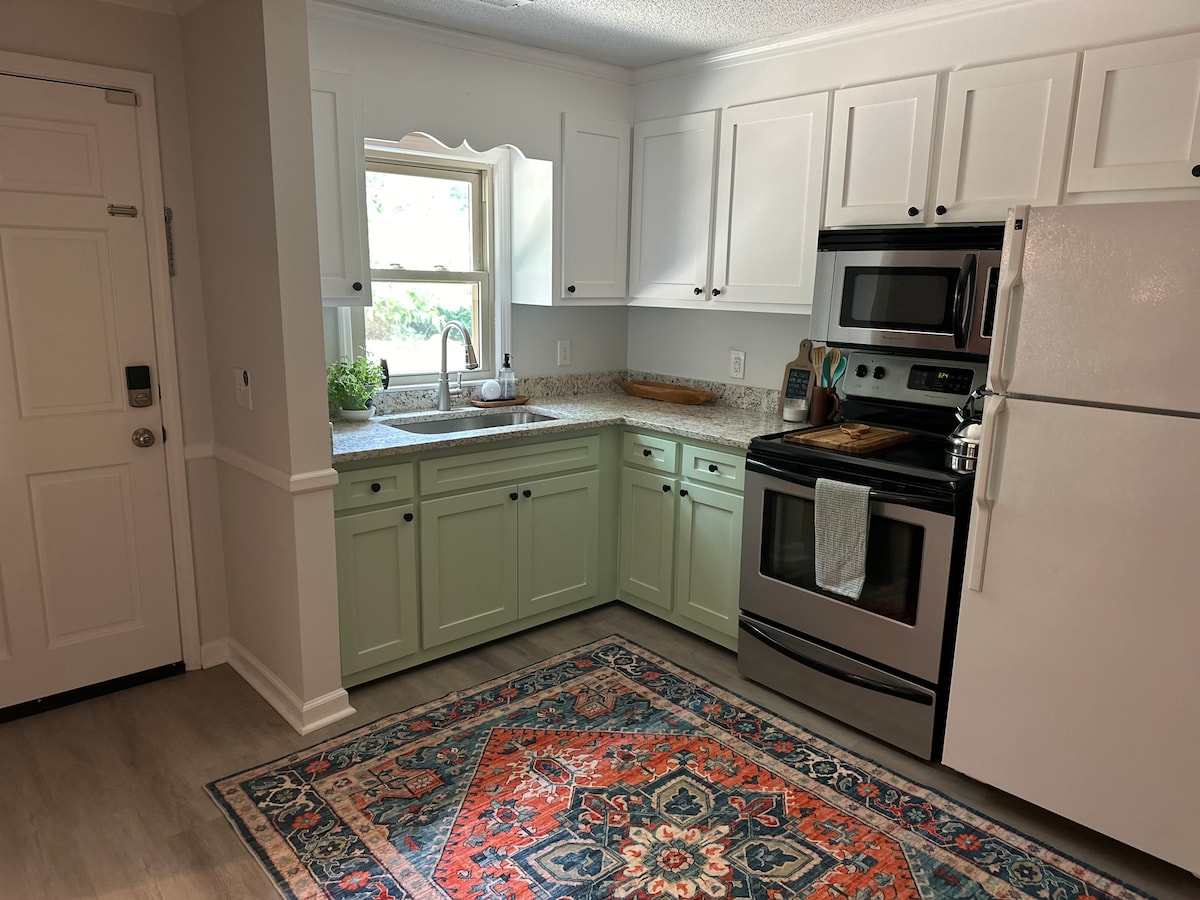 Modern, charmant und in der Nähe der Innenstadt von Greenville bietet diese private und sichere Wohnung Komfort und Luxus, wenn Sie in der Nähe der Stadt sein möchten (5 Minuten oder weniger), ohne das Budget zu überfordern. Du hast einen Parkplatz vor der Haustür, Granit-Arbeitsplatten, Designerarmaturen, 9 Fuß hohe Decken, Deckenleisten und Holz- / Fliesenböden im gesamten Gebäude. Die voll ausgestattete Küche, die Waschmaschine und der Trockner in der Einheit, das Bügelbrett und der Haartrockner machen dies zu einem willkommenen Ort, wenn Sie Greenville für Arbeit oder Vergnügen besuchen!