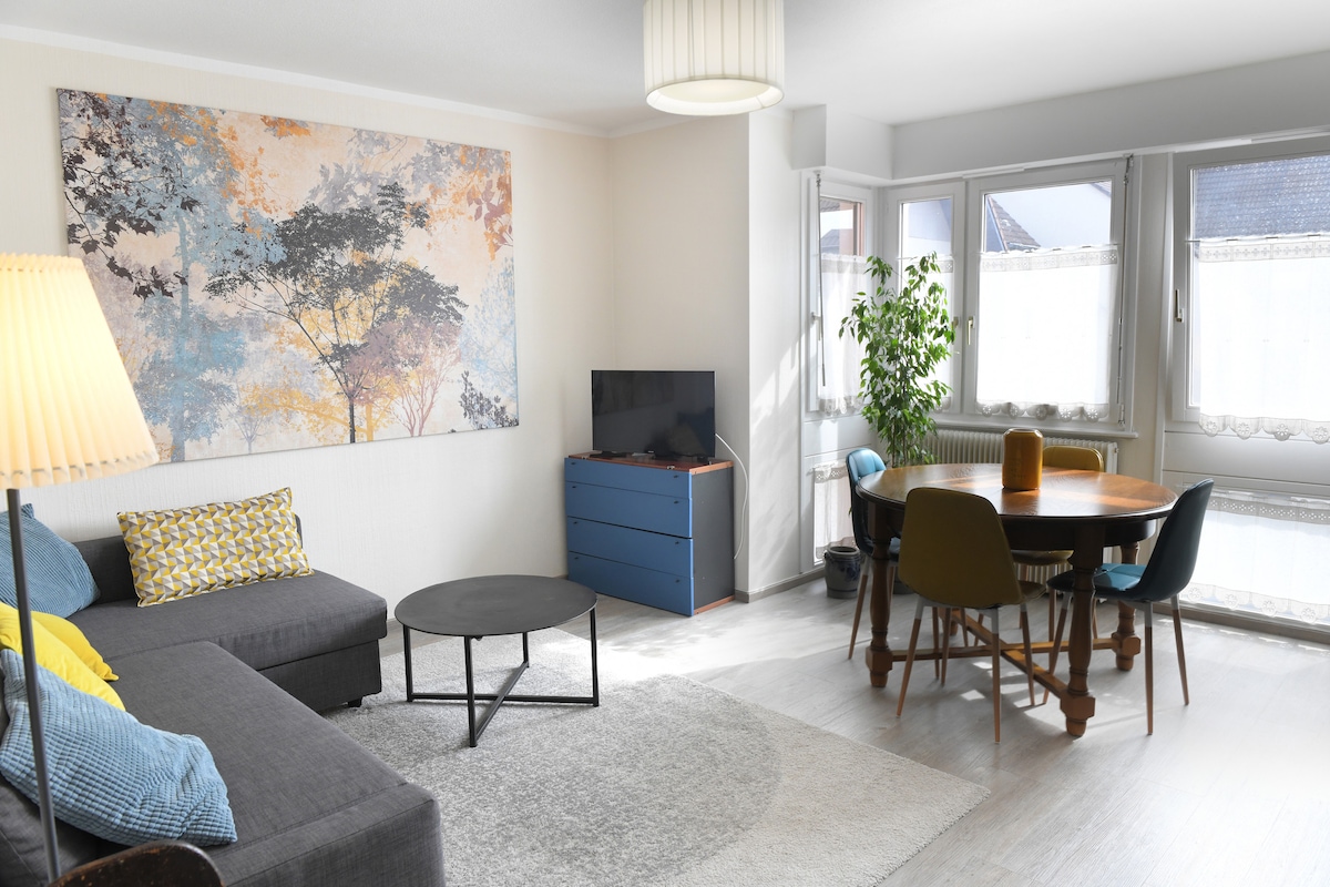 Die ca. 30 m² große Wohnung befindet sich im 1. OG. Die Wohnung ist komplett möbliert, incl. Handtücher und Bettwäsche. In der Küche befinden sich eine Senseokaffeemaschine, Herd, Backofen Toaster und Microwelle. Die Küche ist funktionsfähig aber etwas in die Jahre gekommen. Neue Küche ist für 2026 vorgesehen. In unserer Region gibt es zahlreiche Ausflugsmöglichkeiten (D, CH, FR). Schaut euch hierzu gerne den Reiseführer auf Airbnb an.
