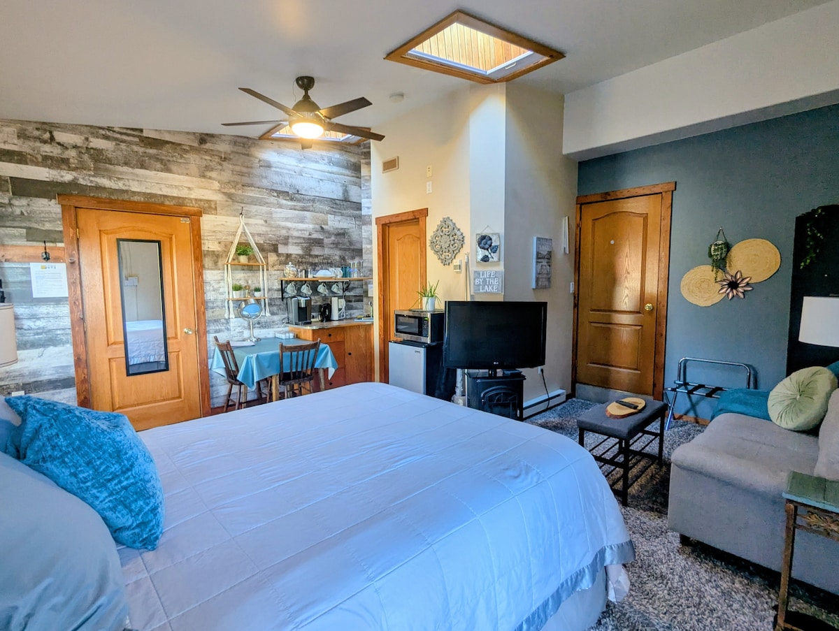 The upper deck is an amazing one bedroom studio with a full newly renovated bathroom, a sweet kitchenette, an amazing king size bed, a 65 “ inch HD smart Samsung TV with a live edge counter- a great workspace or eating area. One wall is floor to ceiling windows -lots of great natural light!!! Outdoors has an amazing hot tub , rustic firepit area , a beautiful covered outdoor eating area with Bbq and you can hear the lake!! Note- the studio is a separate but is part of a house.