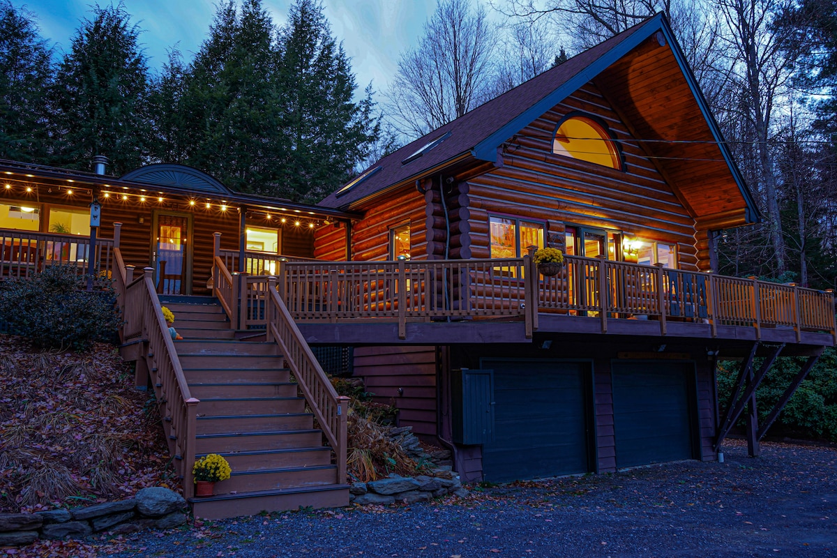 Willkommen in unserer Vermont-Hütte - einem geräumigen, lichtdurchfluteten Rückzugsort, der aus lokal geernteten Baumstämmen gebaut wurde und von Gärten und Ruhe umgeben ist. Innen: ein offenes Loft mit Queensize-Bett, Fenstersitz und Einbauschränken; voll ausgestattetes Badezimmer mit Dusche; voll ausgestattete Küche; umlaufende Couch mit Queensize-Ausziehbett; Smart-TV, Klimaanlage, Waschmaschine/Trockner. Genieße draußen die Feuerstelle, die umlaufende Terrasse, die hintere Veranda mit Adirondack-Stühlen, blühende Gärten, Waldwege und den einfachen Zugang zu Schwimmplätzen, Wanderwegen und Herbstfarben.