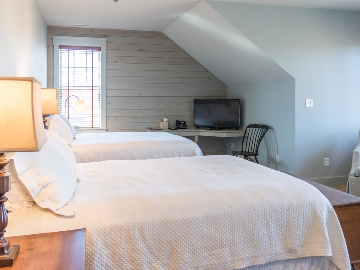 Genieße den poetischen Tar River Room, der mit Kunst geschmückt ist und den Raum mit der natürlichen Pracht des Flusses malt. Das antike weiße Eisenbett ruft wie ein alter Freund und lädt dich ein, eine Weile zu bleiben. Die Vintage-Stühle und Möbel locken und bieten einen vertrauten Komfort, der es unmöglich macht, sich zu verlassen. Wenn die Welt im Freien ruft, bietet das moderne Badezimmer jeden modernen Luxus und erinnert dich daran.
