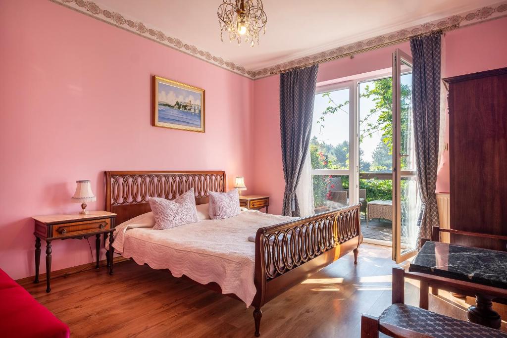 Ein rosa Zimmer für 3 Personen, mit einer Terrasse.