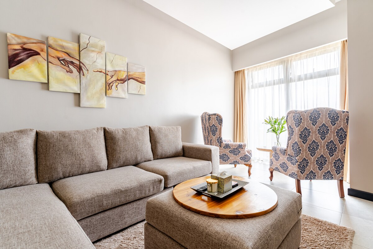 Genieße Komfort in dieser eleganten 2-Zimmer-Wohnung im ruhigen Viertel Lavington. Stilvoll eingerichtet mit warmen Oberflächen, bietet es einen Pool, Fitnessraum, schnelles WLAN, Waschmaschine und sicheren Parkplatz. Angrenzend an einen 3-minütigen Spaziergang 24-Stunden-Naivas-Lebensmittelmarkt und nur wenige Schritte von der Junction Mall zum Einkaufen, Essen und sozialen Treffpunkten. Karen, Kilimani & Westlands sind nur eine kurze Autofahrt entfernt, ideal für Geschäfts- und Urlaubsreisen.