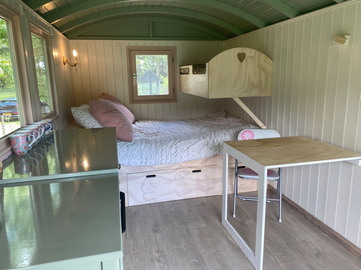 Gemütliches, winziges (12 m2) romantisches Ferienhaus (eigener Eingang und Parkplatz) am Stadtrand von Winterswijk-Corle in der Nähe von schönen Wander-/Rad-/Reitwegen und auf dem Gelände eines denkmalgeschützten Bauernhofs gelegen. Ausgestattet mit allen Annehmlichkeiten, aber "einfach" eingerichtet. Geeignet für 1 oder 2 Personen und für 1 oder mehrere Tage/Wochen zu vermieten. Besonders geeignet für Menschen, die Ruhe und Natur lieben und abenteuerlustig sind. Nicht geeignet für Menschen mit Behinderungen und Kinder Haustier(e) nach Absprache willkommen!
