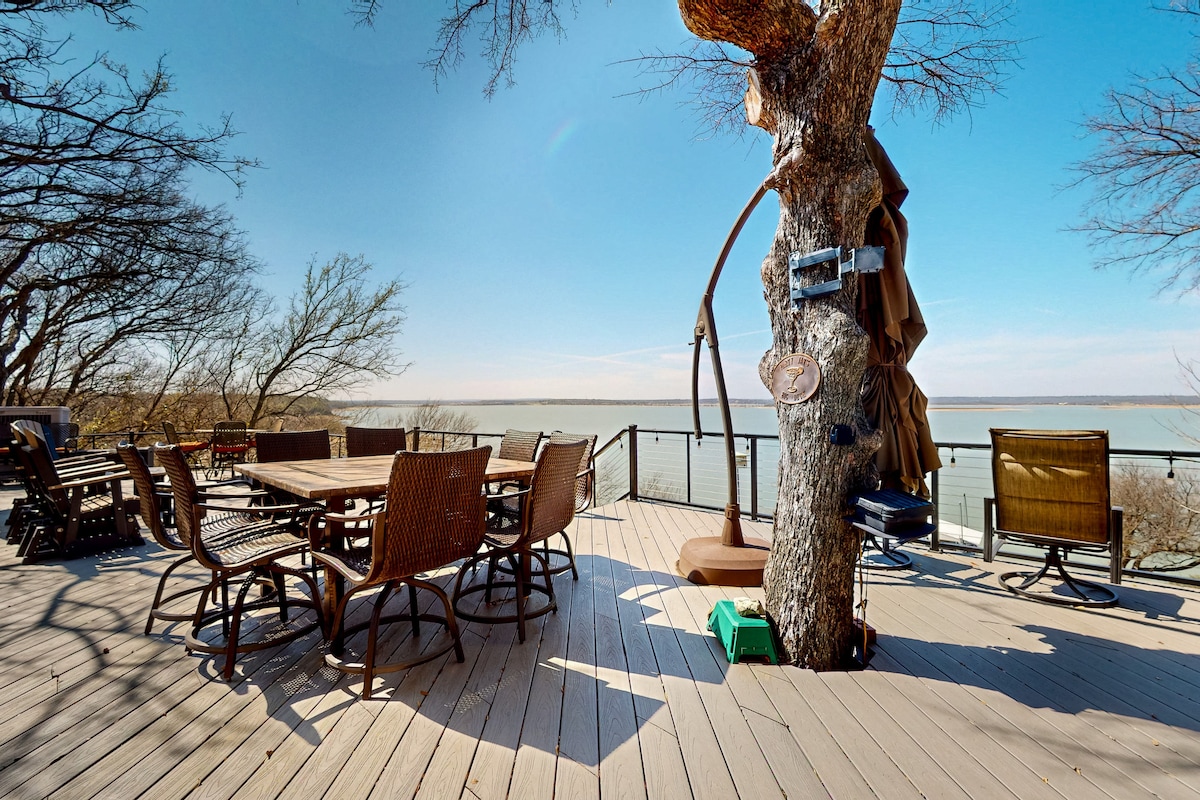 Lakefront, Private Dock, Spectacular Views, Spacious, Modern , 2 Large Decks, Firepit, Rock Fireplace. Lakeview Hideaway at Lake Bridgeport, TX is the place to reconnect with family and friends. This 5Br/3.5B luxury waterfront home features over 3,000 square feet and is ready for your large family getaway. Sitting lake side on a deep slough of Lake Bridgeport, this home offers great water views from two decks, quick access to the water, a shaded tree covered lot, and ample space.