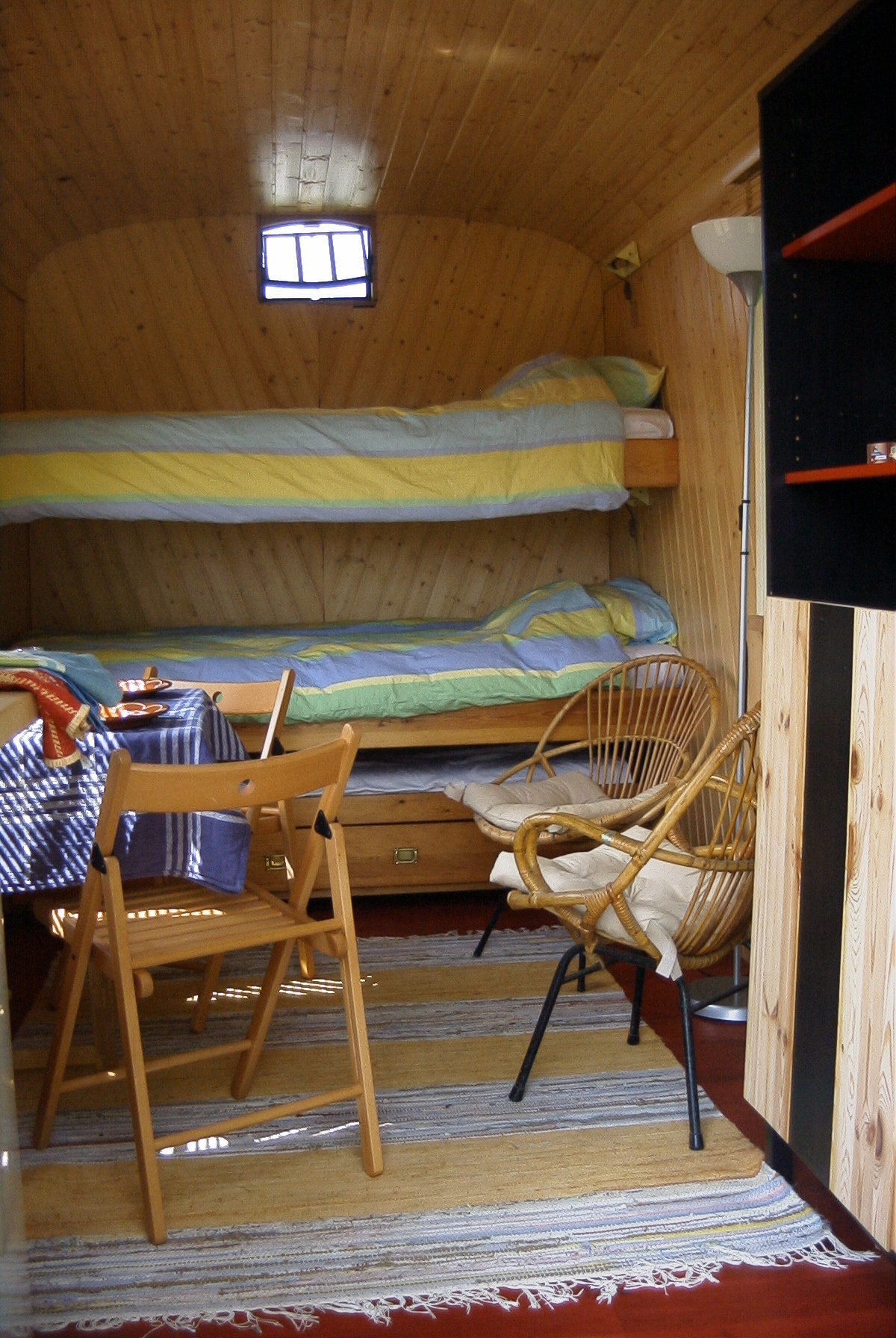 Der Pipo-Wagen hat ein schlichtes, komfortables Design. Mit zwei Etagenbetten von 200 x 90, die bereits mit einer Feder bezogen sind. Außerdem gibt es einen Kühlschrank, eine Kaffeemaschine und einen Wasserkocher. Und für kalte Tage ein Herd Und ein kleines Frühstück für den nächsten Morgen
