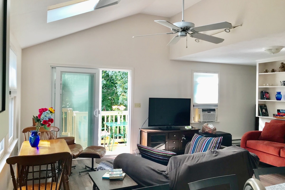 Schöne, sonnige Wohnung mit privater Terrasse. 5 Gehminuten von der Innenstadt, Geschäften, Cafés, Bibliothek und Restaurants entfernt; steigen Sie auf den Nashua River Rail Trail, wo Sie zu Fuß/mit dem Fahrrad in benachbarte Städte gehen können. Genieße alles, was Groton zu bieten hat, kilometerlange Wanderwege, miete ein Kanu/Kajak, Golf, Reiten, Angeln, Apfel-, Kürbis- und Beerenpflücken, gehe hinauf zum Bancroft Castle auf Gibbet Hill, wo „Little Women“ gedreht wurde & genieße die Aussicht. Verpassen Sie nicht einen Besuch bei Groton Hill Music, unserem erstklassigen Musikveranstaltungsort 🎶