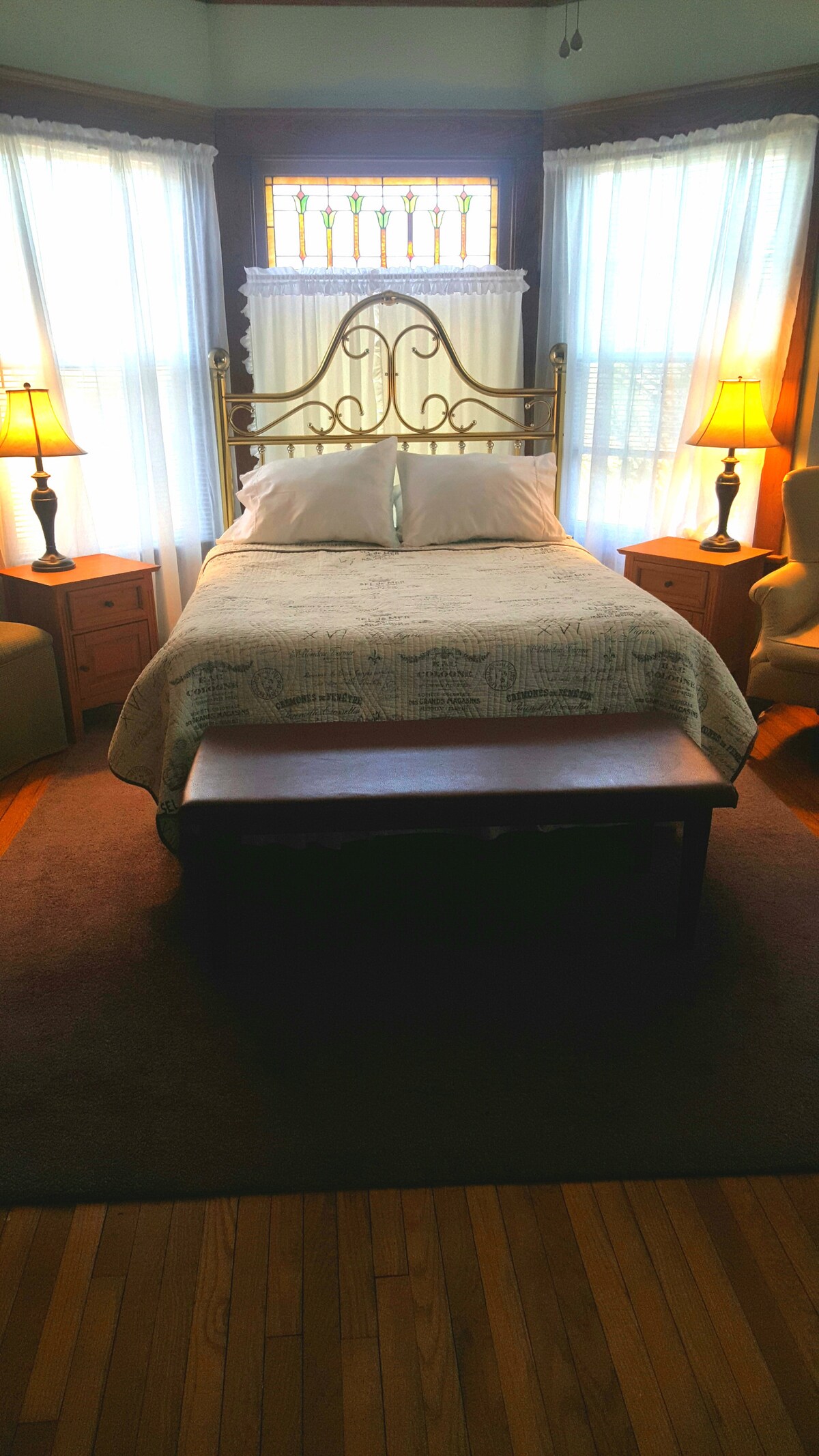 Betritt dieses süße, romantische Schlafzimmer auf der ersten Etage durch schöne French Doors. Versteck dich an einem romantischen Ort, um sich auf einem Queensize-Bett zu entspannen, das mit frischer, bandfrischer Bettwäsche besteht, die von der Buntglaskischete umgeben ist,die dir das Gefühl geben wird, die Ära der 1920er Jahre gibt. Du hast Zugang zur vorderen Veranda, wo du den Blick auf den Garten sowie morgendliche Sonnenaufgänge über dem schönen Seneca-See genießen kannst. Es gibt eine beheizte Badewanne mit einer Dusche für zwei Personen und ein separates „Toilettenzimmer“. Ein gemütlicher Tisch mit zwei Stühlen ist ein perfekter „Morgenkaffee“ -Platz. Genieße zwei weitere Entspannungsstühle mit Lampe, um zu lesen oder fernzusehen. Ein verspiegelter Schrank mit Schubladen und Hängeräumen.