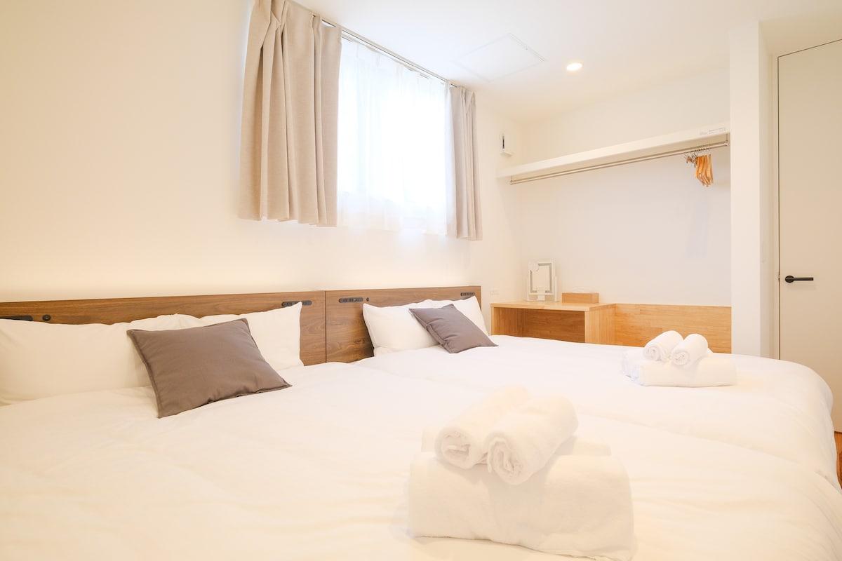 Tsukasa Eigentumswohnung mit Parkplatz für 1 Auto auf dem Grundstück im Zentrum von Naha. * Es können nur leichte Fahrzeuge abgestellt werden.Es ist kein Platz für normale PKWs. Es gibt viele Monorail-Bahnhof Miebashi (7 Minuten zu Fuß), Supermärkte (2 Minuten zu Fuß), 24-Stunden-Supermarkt (10 Minuten zu Fuß), Kokusai Dori (12 Minuten zu Fuß) und lokale Restaurants zu Fuß erreichbar.Es ist nur wenige Gehminuten von der Route 58 entfernt, aber nachts ist es eine relativ ruhige Gegend. Ein ganzes Zimmer.Die Größe beträgt ca. 46 Quadratmeter und verfügt über 2 Schlafzimmer (Schlafzimmer 1 verfügt über 1 Doppelbett 140-200 cm, Schlafzimmer 2 verfügt über 2 Semi-Doppelbetten 120-200 cm), ein Wohnzimmer, eine Küche und ein Badezimmer (Kapazität) für 2 bis 4 Personen. Kostenloses WLAN ist vorhanden und der Geschwindigkeitstest beträgt 50 Mbit/s (Stand Januar 2025).Du kannst es auch als mobiles Arbeiten verwenden. Es gibt auch Küchenutensilien, eine Waschmaschine und einen Trockner, sodass sie perfekt für einen langen Aufenthalt ist.Wir stellen auch Ausrüstung usw. zur Verfügung, aber du wirst sie nach Gebrauch selbst kaufen.Einzelheiten zu Einrichtungen, Einrichtungsgegenständen usw. findest du im Inserat auf dem Foto „Zimmer“. Keine zusätzliche Bettwäsche oder Decken Hat einen Fahrstuhl