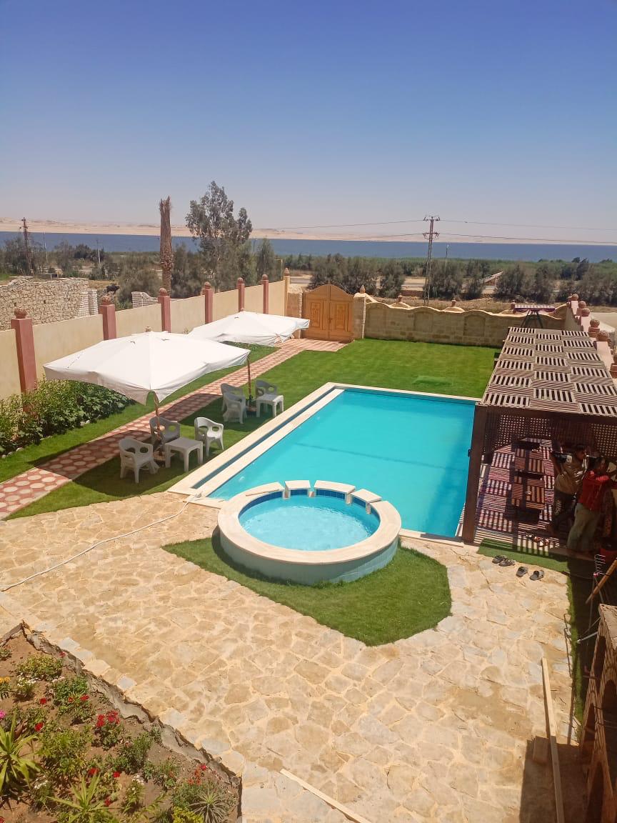Landhaus in Tunis Village in Fayoum, vor dem Qaroun Lake mit Blick direkt auf den See. Es hat - 4 Schlafzimmer: *2 im ersten Stock (1 Zimmer mit zwei Einzelbetten, 1 mit Queensize-Bett) *2 im zweiten Stock (1 Zimmer mit zwei Einzelbetten, 1 mit Queensize-Bett) -Küche mit allen Werkzeugen ex (Schüsseln, Essstäbchen, Teller, Backofen, Kühlschrank usw.) -3 Badezimmer. -Privater Pool . - Privater Garten mit großem Außenbereich.