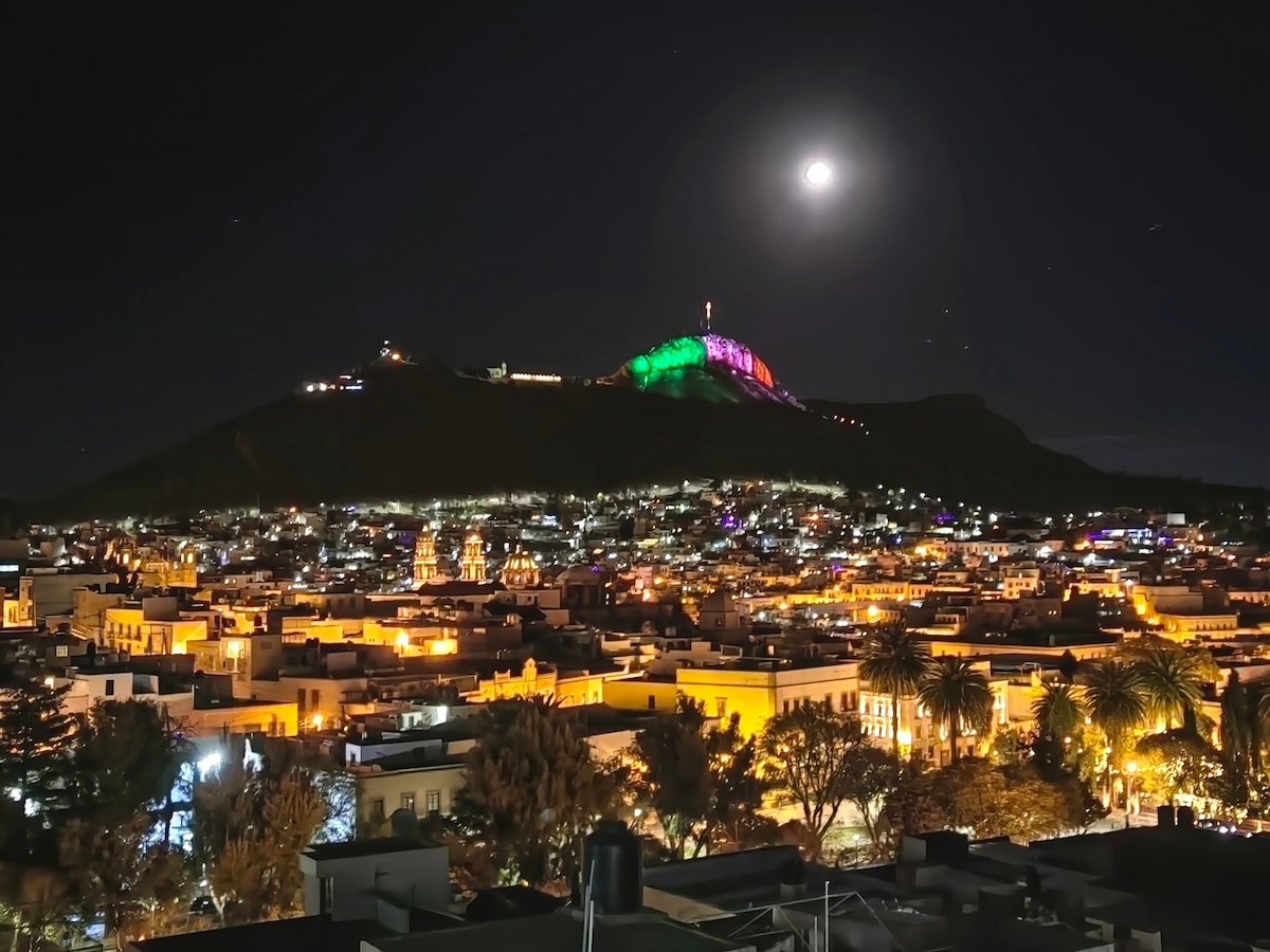 (110 m²) Spacious Family Apartment in Excellent Location! A block and a half to the Alameda Central García de la Cadena "Callejoneadas", 3 blocks to the Edén Mine+Cable Car Ride+La Bufa Hill, Fátima Church, Goitia Museum, 4 blocks to Hotel Quinta Real! In the Beauty and Security of the Historic Center enjoy our amazing Panoramic View with all the comforts: Wi-Fi, Smart TV 42 ", Cable, Netflix, Equipped Kitchen, Quartz Heaters & Fans, Automatic Hot Water 24/7, Parking lot 1 car. Welcome!