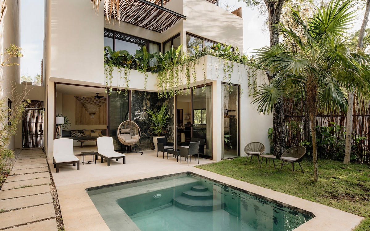 Willkommen in deinem privaten Zufluchtsort in La Veleta 🌿 Perfekt gelegen, nur 7 Minuten von der Innenstadt und 15 Minuten vom Strand entfernt, bietet dieses Haus das Beste aus beiden Welten – einfachen Zugang zur Stadt mit der friedlichen Atmosphäre des Dschungels. Dein Komfort und deine Sicherheit stehen an erster Stelle. Die Unterkunft wird vor jedem Aufenthalt professionell gereinigt und gründlich desinfiziert. Dieses charmante böhmische Refugium liegt eingebettet inmitten von üppigen Ausblicken auf den Maya-Dschungel. Das gesamte Anwesen gehört ausschließlich dir, mit einem privaten Pool und 4 Fahrrädern