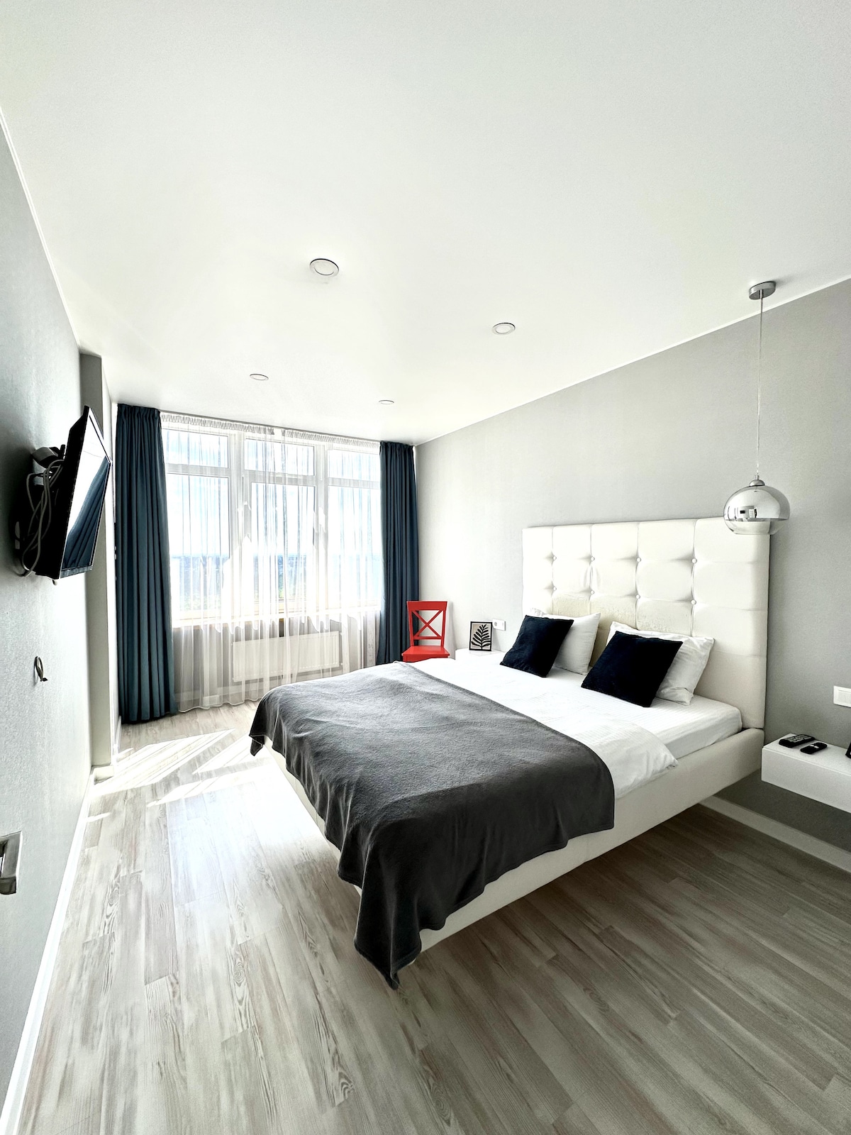Loft style unique design apartment in Kamanina complex in Arkadia Odessa. One queen size bed in the bedroom and a sofa bed in the living room. (2+2) High floor with wonderful sea view, 500 meter to the beach and to the famous Arkadia city alley, full of clubs, restaurants, beach clubs, water and sport activities. There are coffee shops, restaurants, beauty salons, hookah bars, small grocery shops, a big supermarket and a post office at the complex. Yunist park is attached.