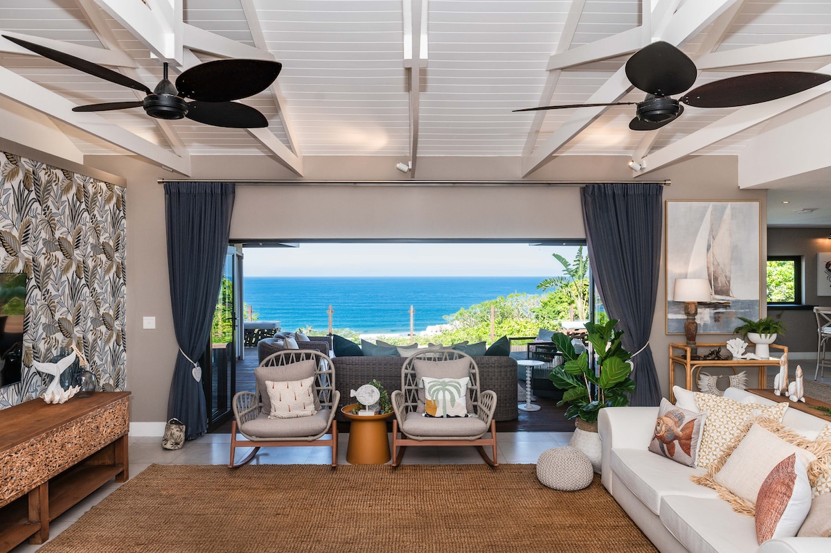 Our wonderful 5 bedroom double-storey home is on an amazing site, with direct access to the beach & tidal pools. The generous living spaces are delightfully furnished and equipped for comfort, rest and leisure and its views will relax and invigorate you. It is ideal for enjoying precious family gatherings and fun holidays to the max. The neighbouring café is a local favourite and the area has many restaurants with the shopping and entertainment hubs of Ballito and Salt Rock a short drive away.