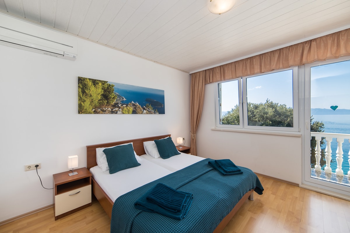 Our home and the town are ideal for peaceful holidays away from noisy streets and crowded places. Apartment has two bedrooms with comfy beds, a spacious balcony with view over olive tree garden and sea. It's professionally cleaned and equipped with everything you need for a pleasing stay. Access to private outside patio with BBQ, TV, seating and view over olive trees garden. WIFI, free parking lot, air condition, TV. Great for families, friends groups, business travelers.